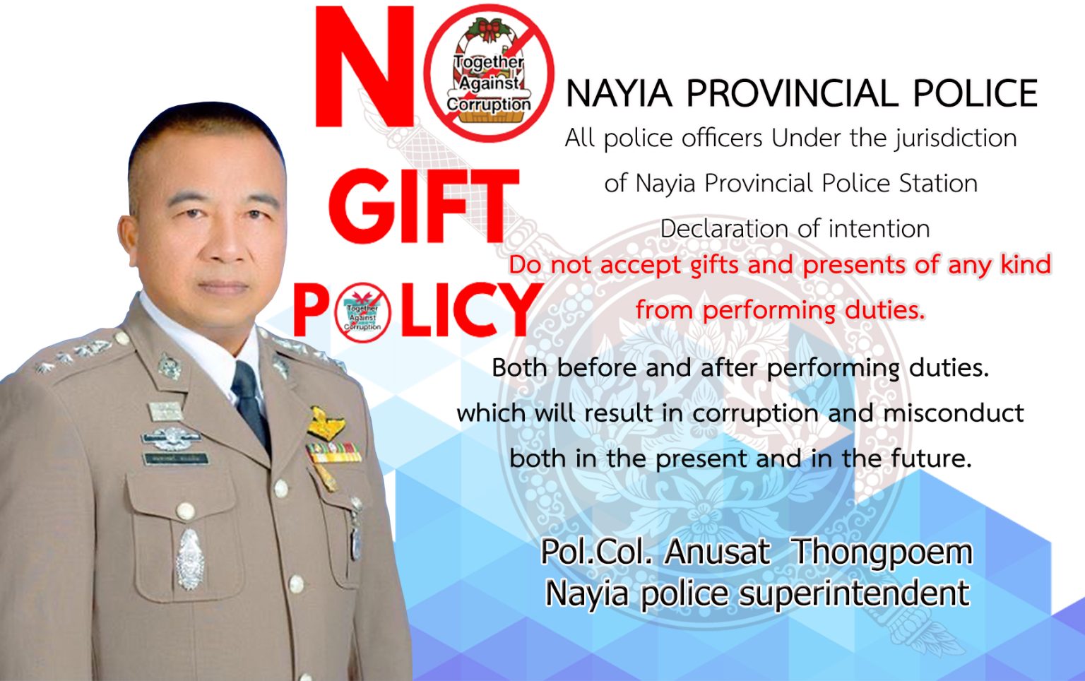 พ.ต.อ.อนุศาสตร์ ทองเพิ่ม ผู้กำกับการสถานีตำรวจภูธรนาเยีย ประกาศเจตนารมณ์ของหน่วยงาน ในการป้องกันการและต่อต้านการทุจริตชองสถานี