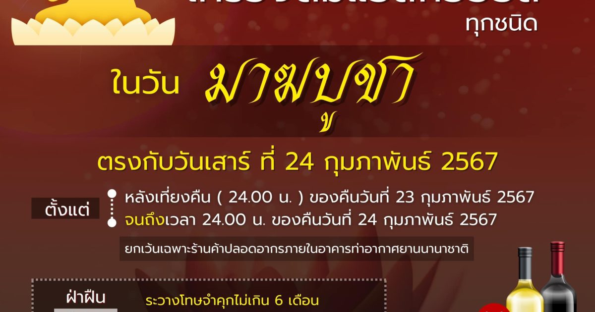 สำนักงานตำรวจแห่งชาติเตือนงดจำหน่ายเครื่องดื่มแอลกอฮอล์ เนื่องในวันมาฆบูชา ประจำปี 2567 ทุกช่องทาง ด้านผู้บัญชาการตำรวจแห่งชาติกำชับดูแลความปลอดภัย พร้อมอำนวยความสะดวกการจราจรสถานที่สำคัญทางพุทธศาสนา และสถานที่ท่องเที่ยว